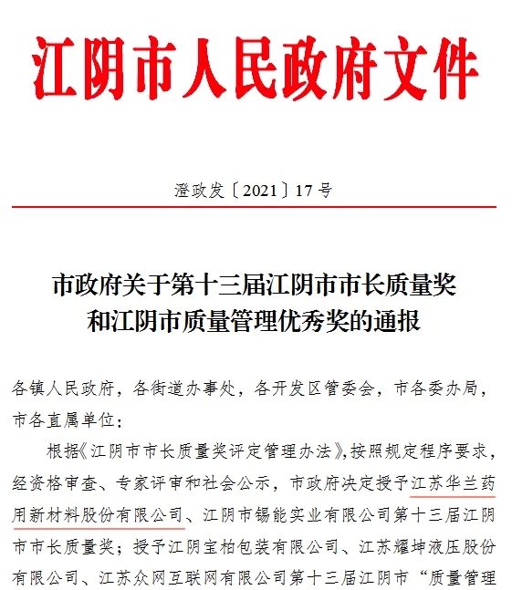 公司榮獲第十三屆“江陰市市長(zhǎng)質(zhì)量獎(jiǎng)”。2021年開始的“十四五”時(shí)期,形成以國(guó)內(nèi)大循環(huán)為主體、國(guó)內(nèi)國(guó)際雙循環(huán)相互促進(jìn)的新發(fā)展格局。華蘭把握國(guó)家“十四五”時(shí)期新發(fā)展階段的新機(jī)遇和新挑戰(zhàn),始終把華蘭制造向華蘭創(chuàng)造轉(zhuǎn)變、把華蘭速度向華蘭質(zhì)量轉(zhuǎn)變、把華蘭產(chǎn)品向華蘭品牌轉(zhuǎn)變”。堅(jiān)持精耕實(shí)做,強(qiáng)化創(chuàng)新、管理、融合、投資、責(zé)任意識(shí),為開啟華蘭打造世界領(lǐng)先企業(yè)的新篇章加油!