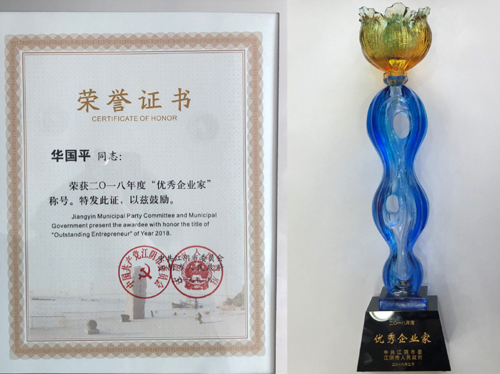 表彰會(huì)上,公司董事長(zhǎng)華國(guó)平先生榮獲2018年“江陰市優(yōu)秀企業(yè)家”稱號(hào),全市共評(píng)選表彰優(yōu)秀企業(yè)家35名。